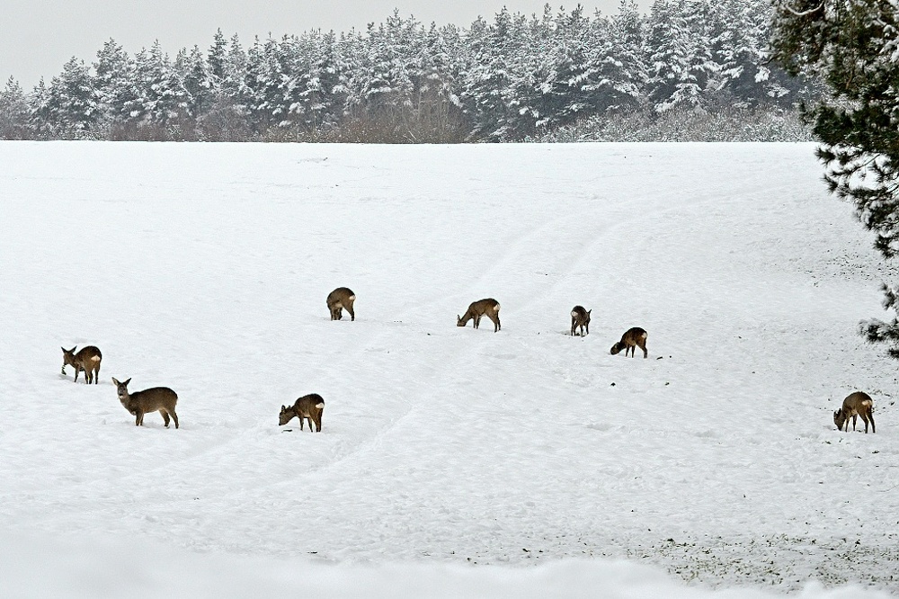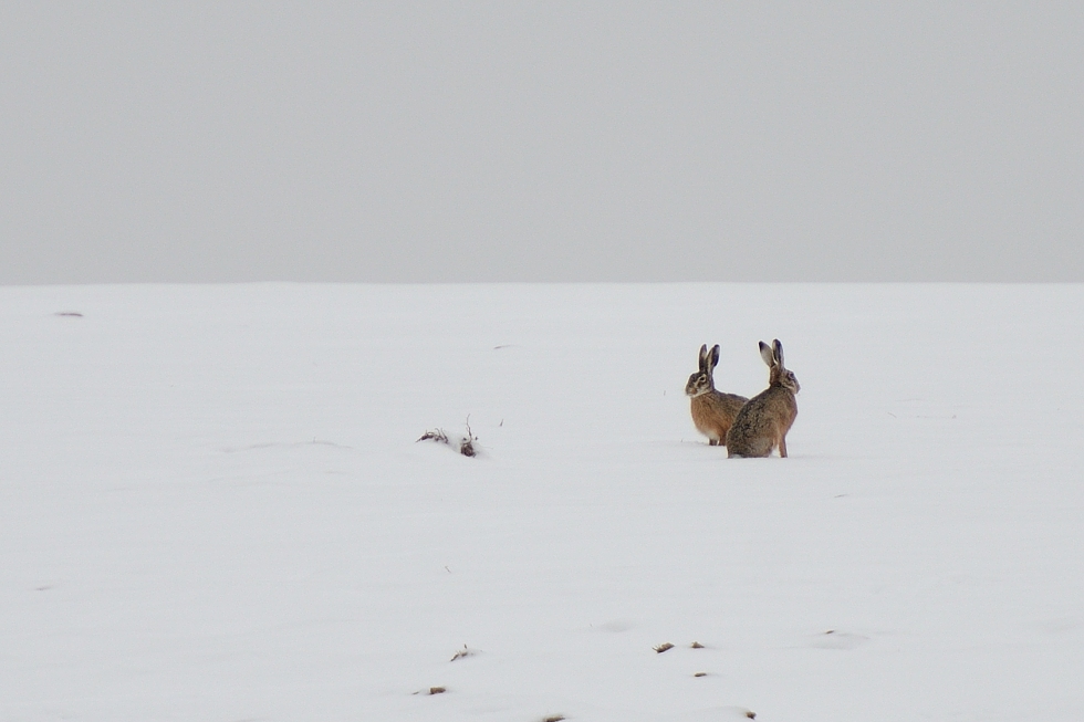 Vyhrabávali zelená lupena na poli skováni v dolíku.Vítr šel naštěstí od nich. Hned jak jsem je zahlédl jsem zalehl, opatrně sundal batoh ze zad a začal vyndavat foťák. Po oku jsem je pořád sledoval. Stačil jeden neopatrný pohyb a vzali nohy na ramena. Nakonec jsem se plížením ve sněhu dostal asi na třicet metrů. Víc už to bohužel nešlo…a ještě to špatné světlo, poletoval sníh.